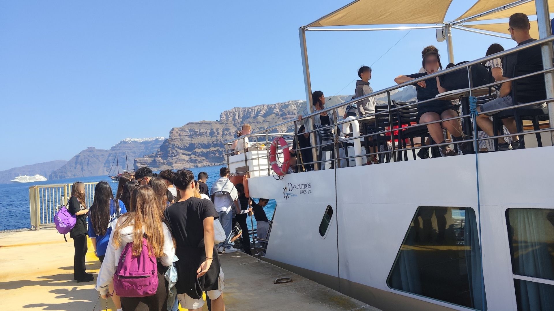 Την τρίτη ημέρα, μεταβήκαμε στο λιμάνι του Αθηνιού και επιβιβαστήκαμε σε καραβάκι με προορισμό τη Νέα Καμένη. Εκεί περπατήσαμε στο ηφαιστειακό τοπίο του νησιού και είδαμε από κοντά τον κρατήρα του ηφαιστείου, παρατηρώντας άμεσα τα γεωλογικά χαρακτηριστικά που καθιστούν τη Σαντορίνη ένα ζωντανό εργαστήριο περιβαλλοντικής εκπαίδευσης. Στη συνέχεια, επισκεφθήκαμε τη Θηρασιά, ένα νησί που συνδέεται άρρηκτα με την ιστορία και τη γεωλογική εξέλιξη της καλντέρας. Το βράδυ, μεταβήκαμε στην Οία, όπου θαυμάσαμε ένα από τα πιο φημισμένα ηλιοβασιλέματα στον κόσμο!