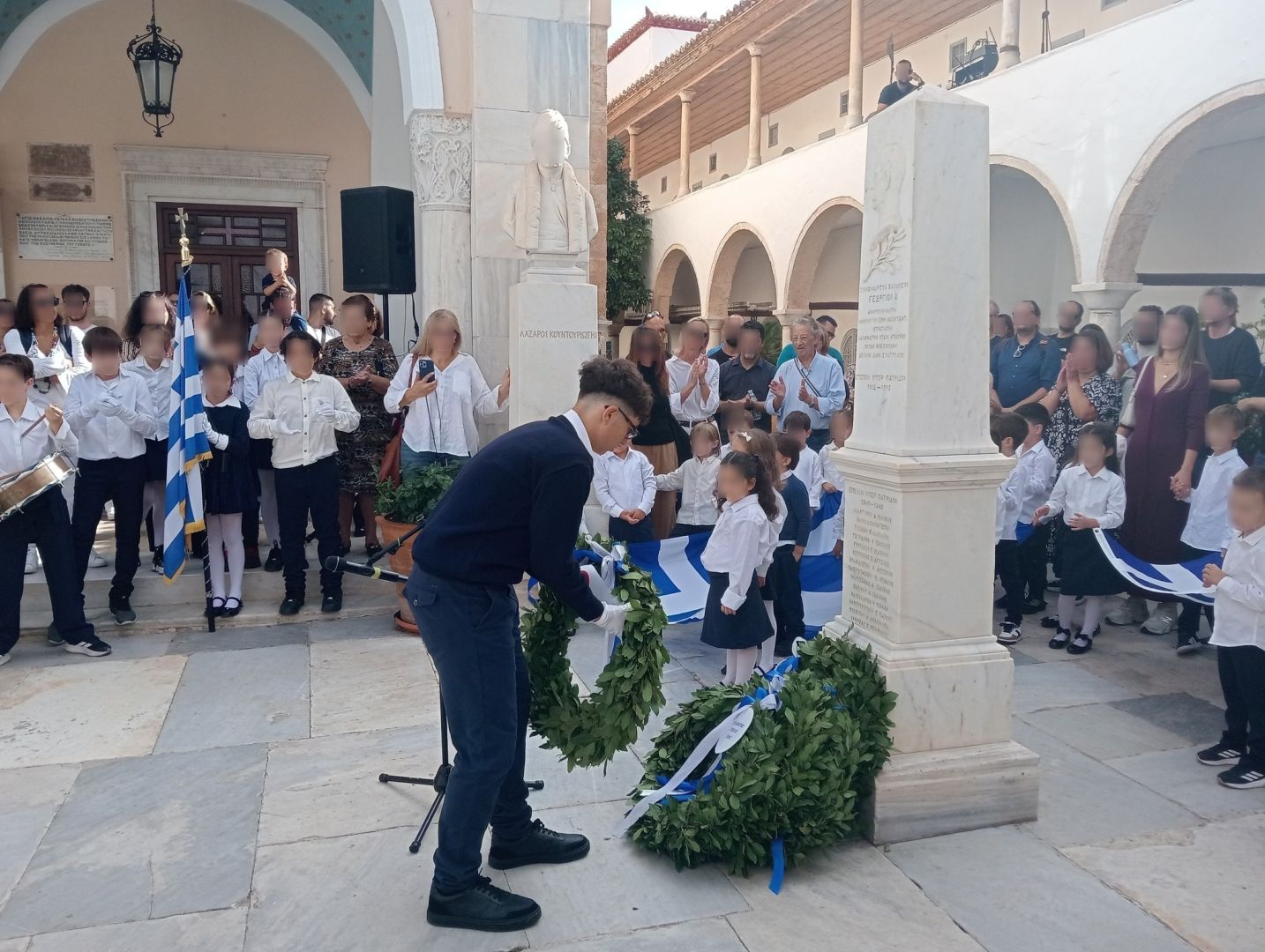 Οι εκδηλώσεις της ημέρας ολοκληρώθηκαν με την κατάθεση στεφάνου στο Ηρώο των Πεσόντων στον προαύλιο χώρο του Ιερού Καθεδρικού Ναού από τον μαθητή της Γ΄ Τάξης Στέφανο Παντελή, ως ένδειξη τιμής και ευγνωμοσύνης προς όλους όσοι θυσιάστηκαν για την πατρίδα.